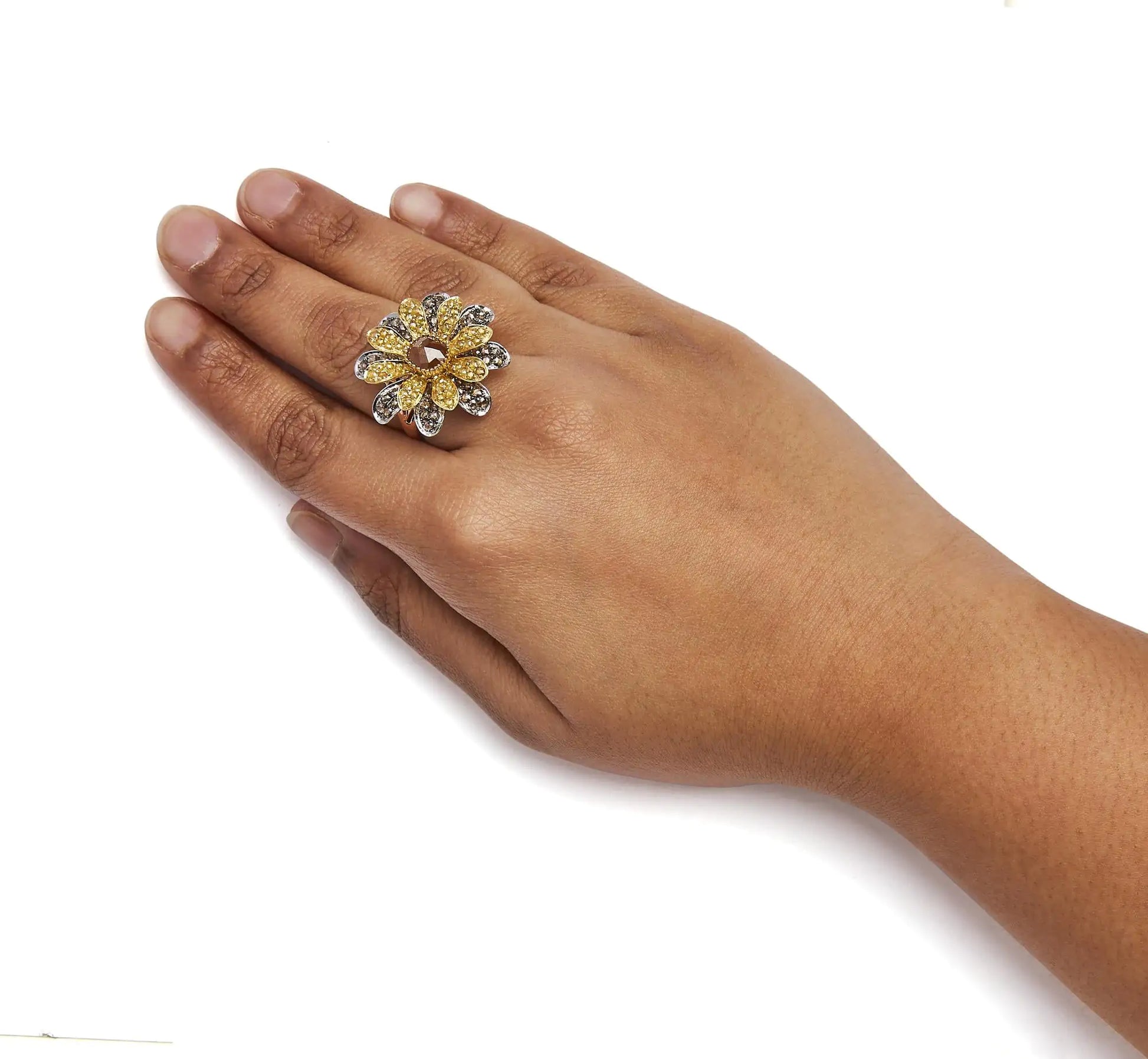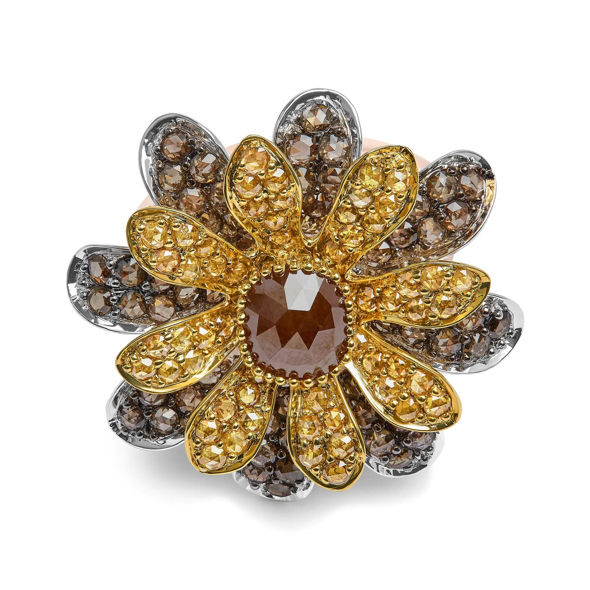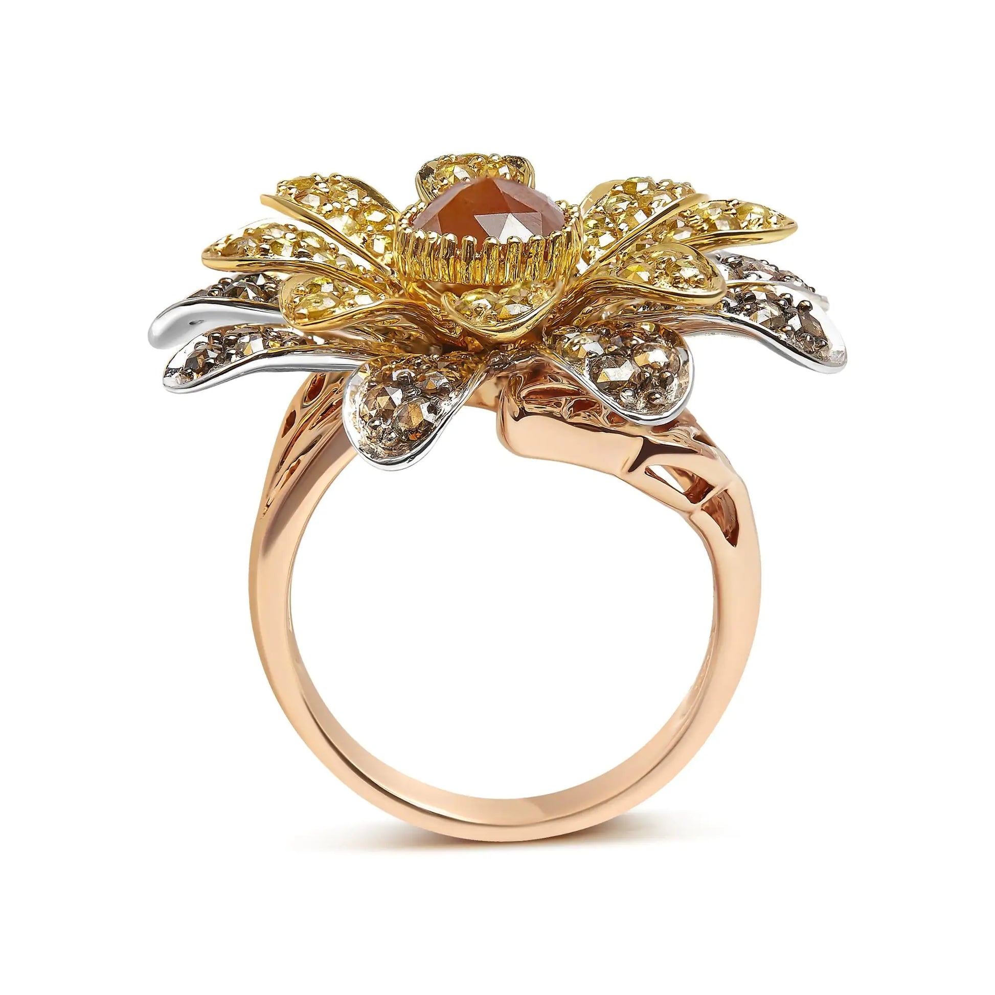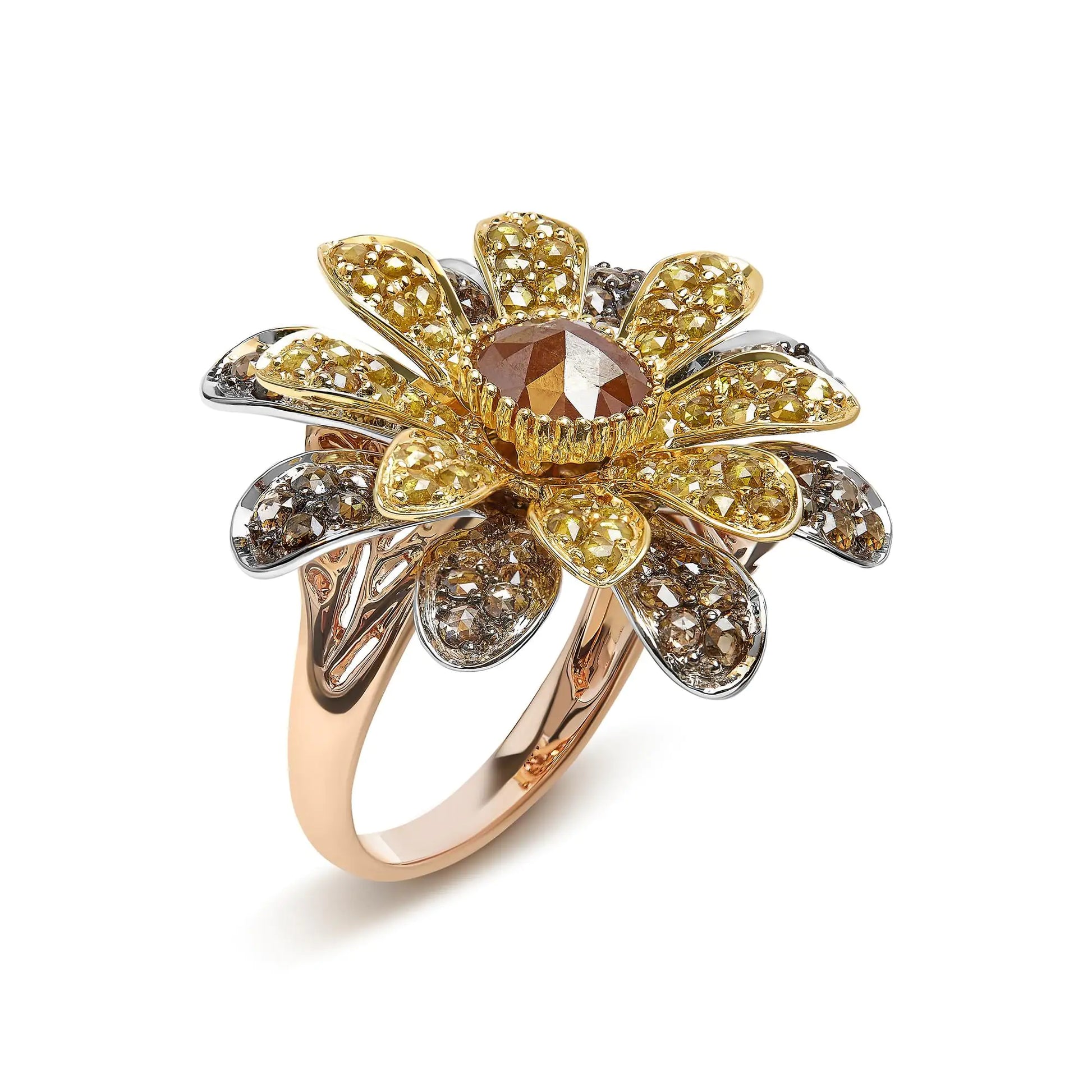 14K Tri-Toned 3 7/8 Cttw Rose Cut Diamond Cocktail Double Flower and Petal Cocktail Ring (Fancy Color, I1-I2 Clarity) - Size 7