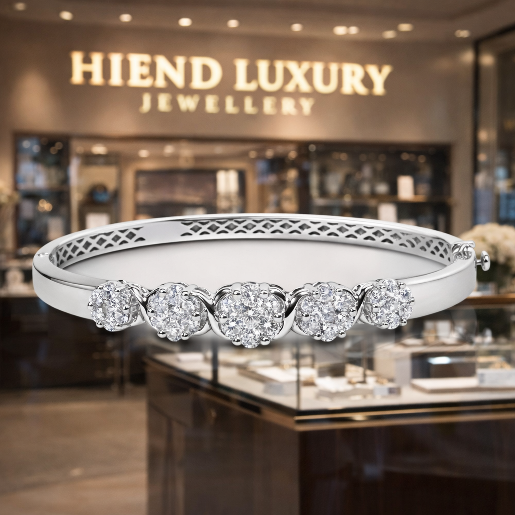 Introducing a breathtaking statement of elegance, this 14K White Gold Bangle Bracelet is a true celebration of timeless luxury. Expertly crafted and adorned with 2 1/2 carats of natural diamonds, the design features five radiant floral clusters, each meticulously arranged to capture brilliance from every angle.