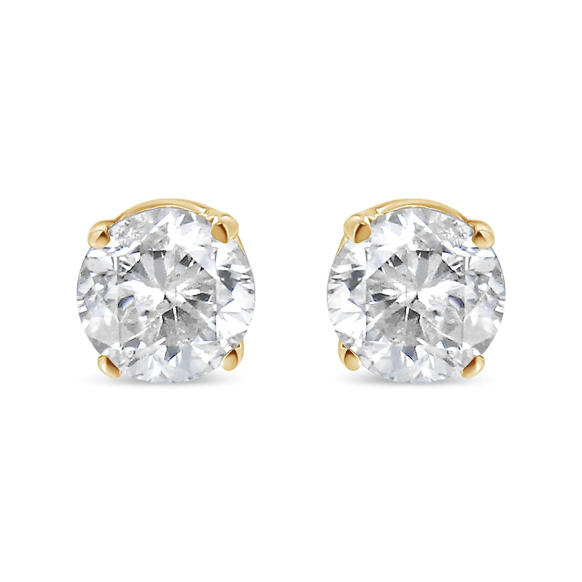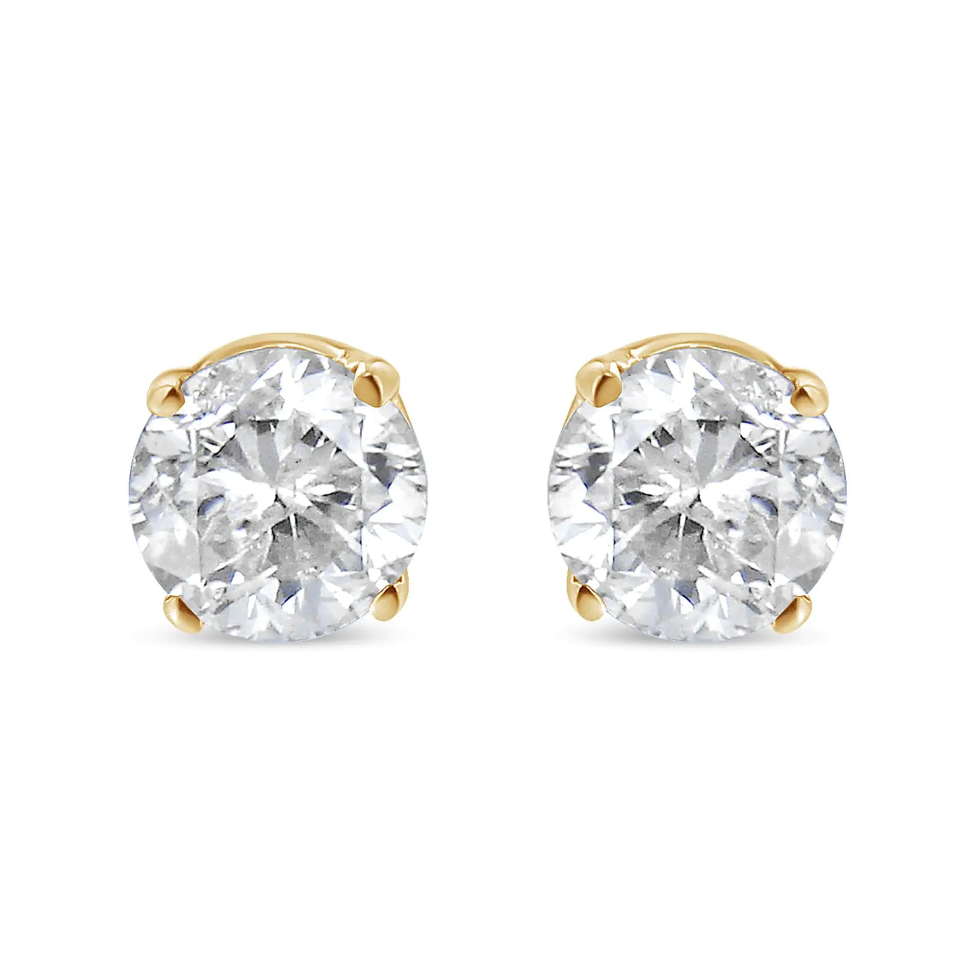 Celebrate any occasion with these classic shimmering diamond stud earrings. Crafted from 14k Yellow Gold each earring showcases a sparkling Brilliant Round-Cut Solitaire Diamond in a 4-Prong Setting. Dazzling with 3/8 cttw of diamonds and a bright polished shine, these Push Back stud earrings secure comfortably on your ear. These diamond studs are certified by the AGS as natural, earth mined diamonds. These diamonds are color rated as M-N Color, and clarity graded as SI2-I1 Clarity . Make these classic diamond studs yours today. Comes as a pair. Each earring piece has a 1/5 cttw diamond and the total weight for this diamond stud pair is 3/8 cttw.
