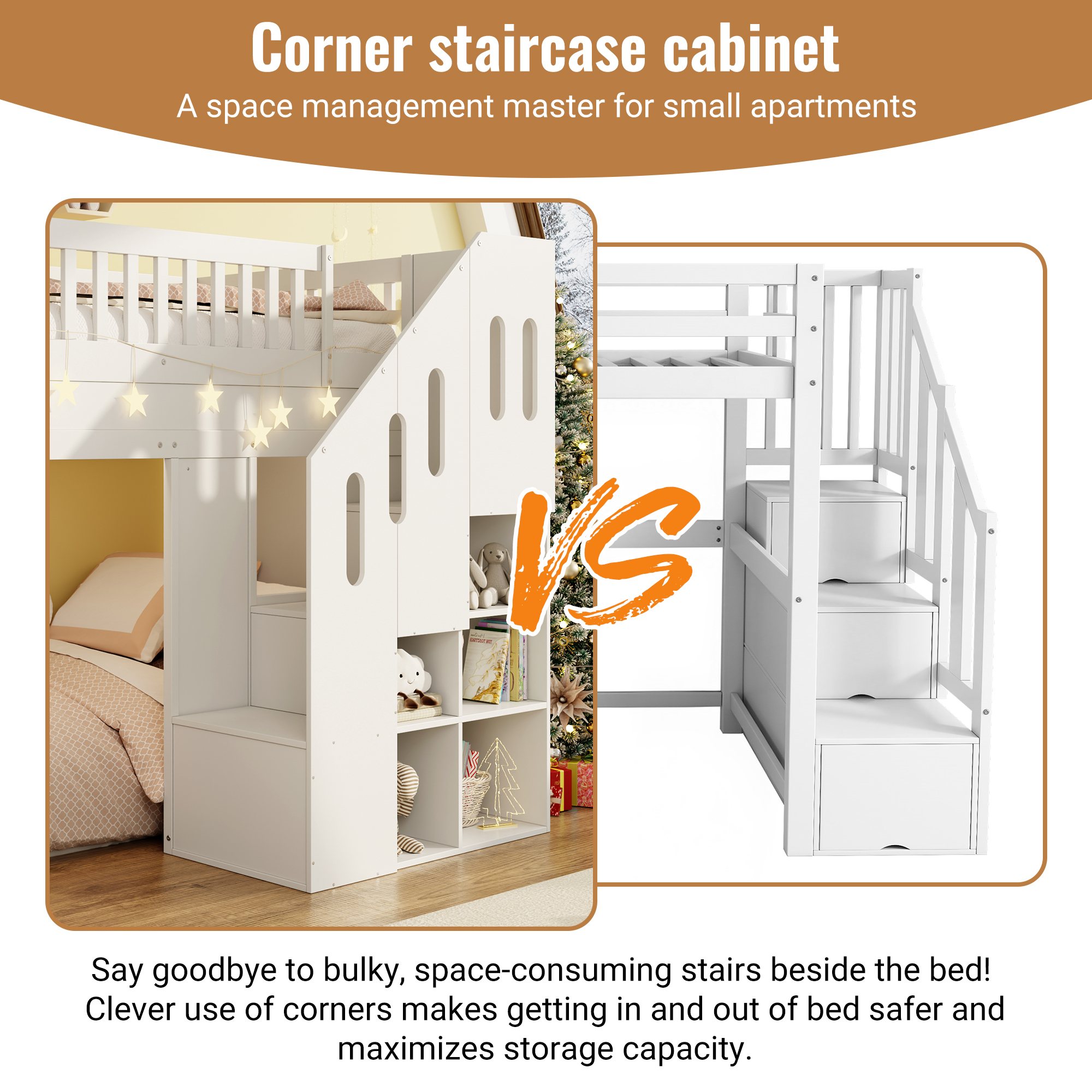 - Corner Storage Staircase: Clever Storage. A cleverly designed corner storage staircase allows children to safely get in and out of bed while providing ample storage space. Toys, books, and clothes can be neatly stored, creating more play space for children – especially practical in small apartments.