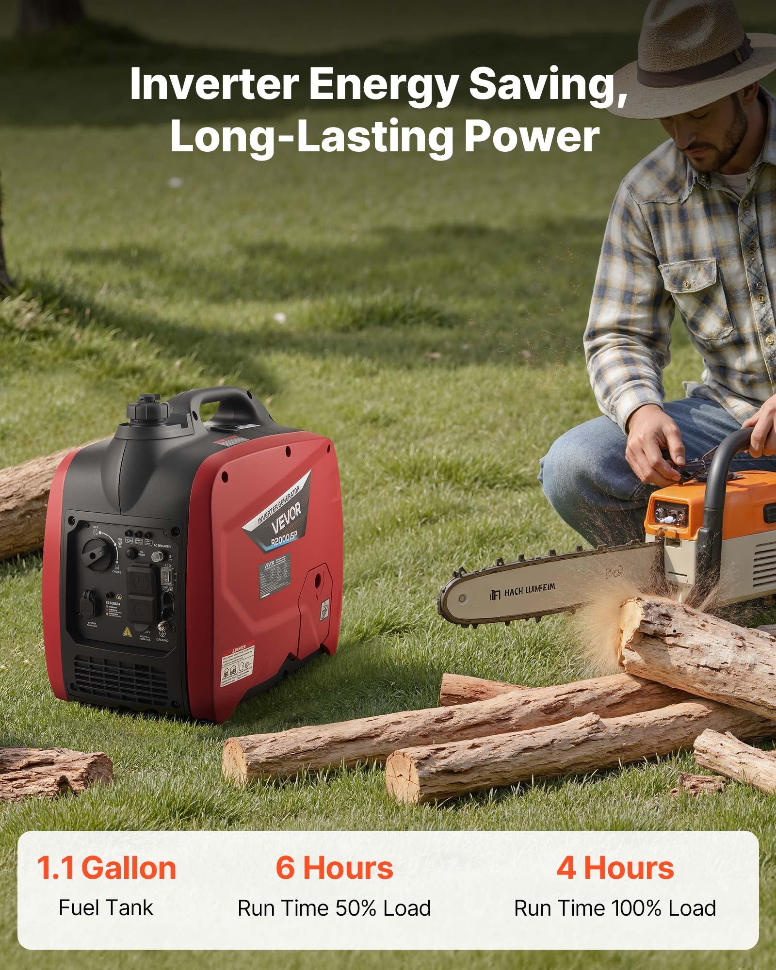 Extended Power Duration: This camper generator features a 1.1 gal / 4.2 L fuel tank with smart inverter efficiency. It runs up to 6 hours at 50% rated power and 4 hours at 100% rated power, delivering long-lasting electricity for outdoor events or camping trips