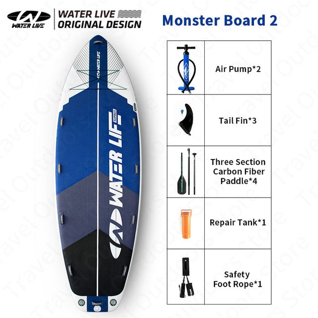 Please note that the WATERLIVE Monster Board inflatable surfboard is designed for recreational use only and should be used in accordance with all relevant safety guidelines and regulations.